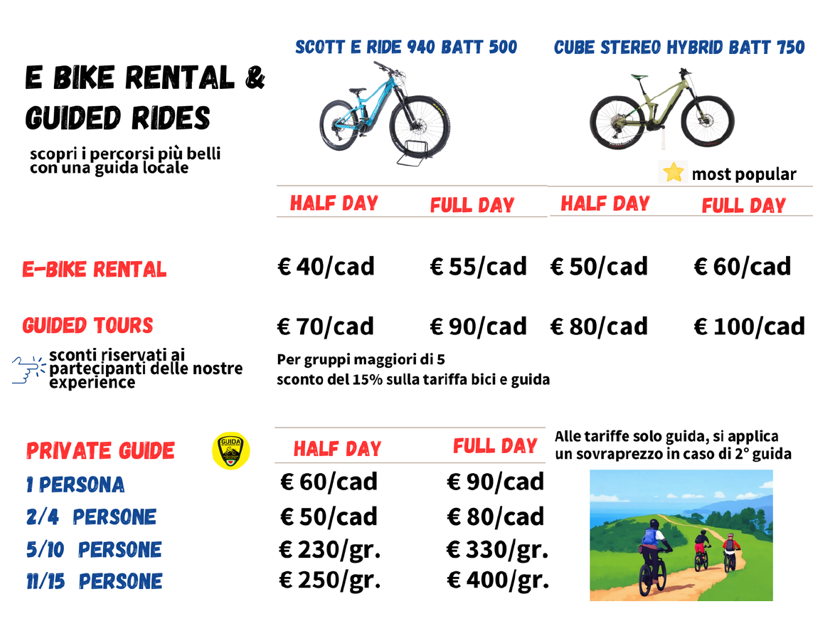 We offer carefully organized guided tours and an impeccable service, with bicycles that are always new, perfectly maintained and ready to deliver top performance.